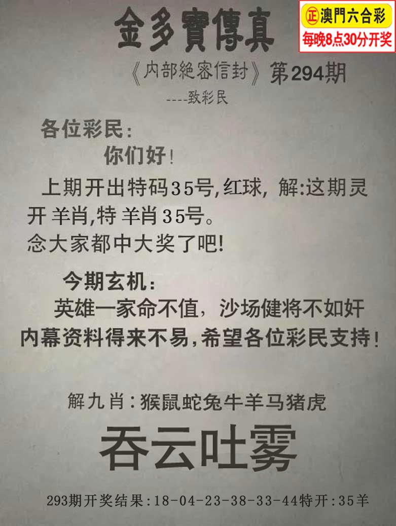 294期金多宝传真: 英雄一家命不值,沙场健将不如奸 解: 英雄一家命不值,沙场健将不如奸,不烂之舌凭三寸,害你一门寡又丧。打一生肖? ... 烂之类舌凭三寸,害你一门寡又丧。 综合九肖:猪猴狗牛龙鸡羊马兔 综合六肖:猪猴狗牛龙鸡 主特12码:31.43.22.46.20.44.29.26.45.47.48.39 主特06码:31.43.22.46.20.44 |